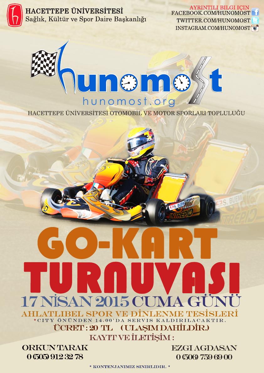 Hacettepe Üniversitesi Otomobil ve Motor Sporları Topluluğu (HUNOMOST), HUNOMOST Karting Turnuvası 2. Yarışı’nı 17 Nisan 2015 tarihinde Çankaya Karting Kulübü Karting Pistinde düzenleyecektir.